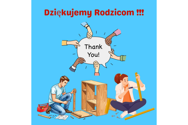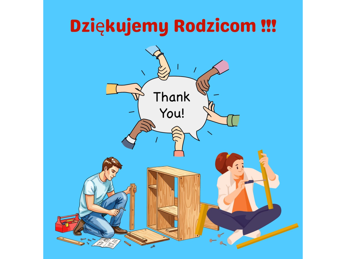 Serdecznie dziękujemy Rodzicom, którzy poświęcili swój czas i cały weekend, aby pomóc w montażu nowych mebli. Dzięki Państwa zaangażowaniu, życzliwości i ogromnej pracy sala nabrała pięknego, funkcjonalnego wyglądu i jest już gotowa, by służyć dzieciom. DZIĘKUJEMY BARDZO PAŃSTWU : MAGDA KAPEL, ALEKSANDER DAGIEL, SŁAWOMIR KOZŁOWSKI, TOMASZ ZYWERT, KAMIL FIRYN, NATALIA I MIKOŁAJ ROJTEK, ANNA I ŁUKASZ RYCHLIK, ALEKSANDRA I PATRYK GUZICCY, AGATA I MATEUSZ SOCHAŃ. Państwa pomoc, cierpliwość i dobra energia są nieocenione. To wspaniałe, że możemy liczyć na taką wspłracę i wsparcie.